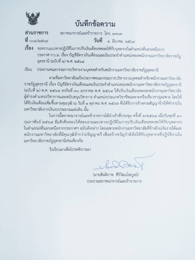 สืบเนื่องจากการออกประกาศ ก.บ.ม. ว่าด้วยบัญชีอัตราเงินเดือนและเงินประจำตำแหน่งพนักงานมหาวิทยาลัยฯ ฉบับที่ 2 ลงวันที่ 30 มกราคม 2564 ส่งผลให้พนักงานมหาวิทยาลัยที่จ้างด้วยงบประมาณแผ่นดิน ได้รับเงินเดือน 1.5-1.7 เท่า ตามมติคณะรัฐมนตรี และได้รับเงินชดเชยส่วนต่างจากฐานเงินเดือนขั้นต่ำที่ไม่ถึงอัตรา 1.5-1.7 ย้อนหลังตั้งแต่ ตุลาคม 2562 ถึงกุมภาพันธ์ 2564 จำนวน 16 เดือน แต่ยังมีพนักงานมหาวิทยาลัยที่จ้างด้วยงบประมาณรายได้ และกลุ่มพนักงานที่มีคุณวุฒิต่ำกว่าปริญญาตรีที่ยังรอโอกาสในการปรับเงินเดือนและเงินชดเชยเช่นกัน สภาคณาจารย์จึงมีมติในที่ประชุมครั้งที่ 2/2564 เมื่อวันที่ 10 กุมภาพันธ์ 2564 เพื่อสอบถามถึงแนวปฏิบัติในเรื่องดังกล่าวต่อ ประธาน ก.บ.ม. เพื่อให้เป็นขวัญและกำลังใจต่อพนักงานทุกประเภทต่อไป